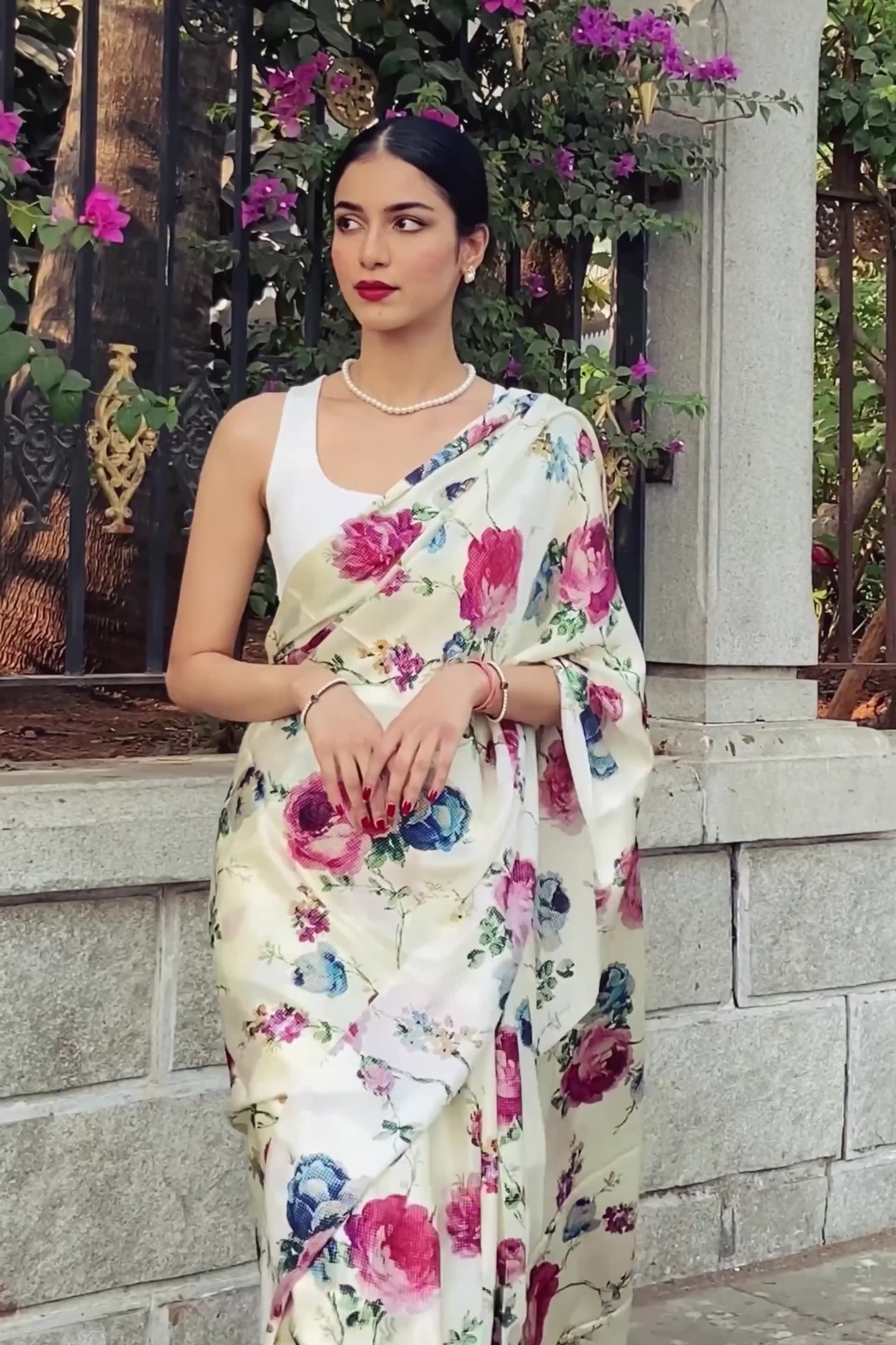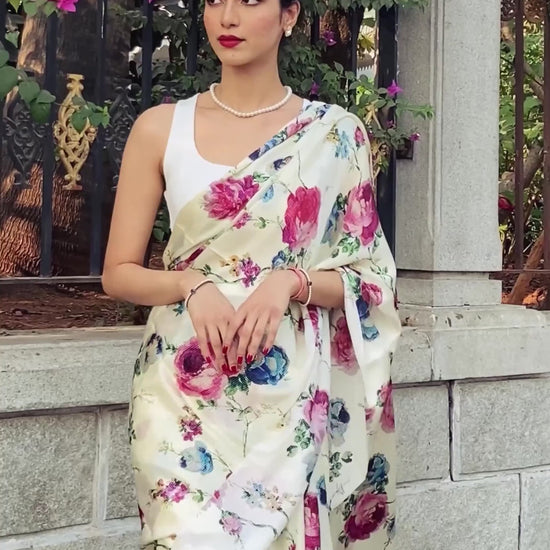 This exquisite white satin saree, made from pure silk, presents a timeless white base with large abstract floral prints in vivid colors. The hand-painted design, digitally rendered, adds a touch of modern sophistication to the classic palette.
