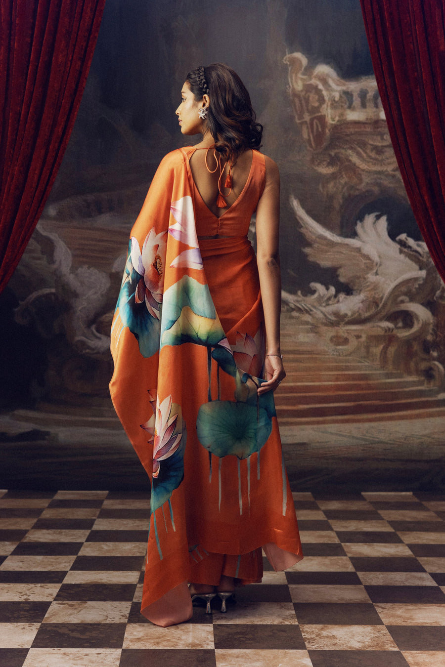 With a rich burnt sienna base and delicate, hand-painted lotuses adorning the border, this saree embodies classic elegance. The warm, earthy tone combined with the graceful floral motif creates a sophisticated and timeless look.