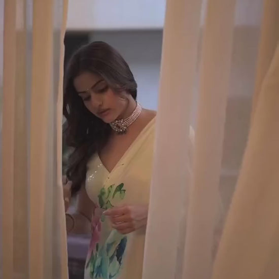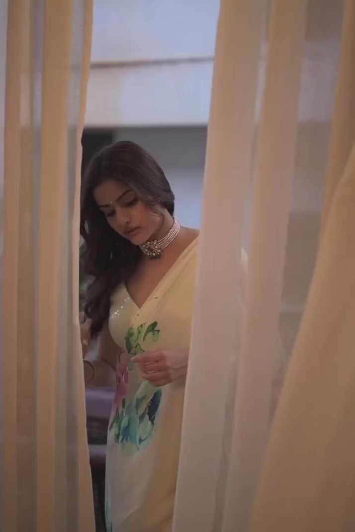 A blend of luxury and artistry, this satin silk saree features a white base with bold, digitally rendered abstract flowers. The hand-painted details in vibrant colors create a striking contrast against the elegant background.
