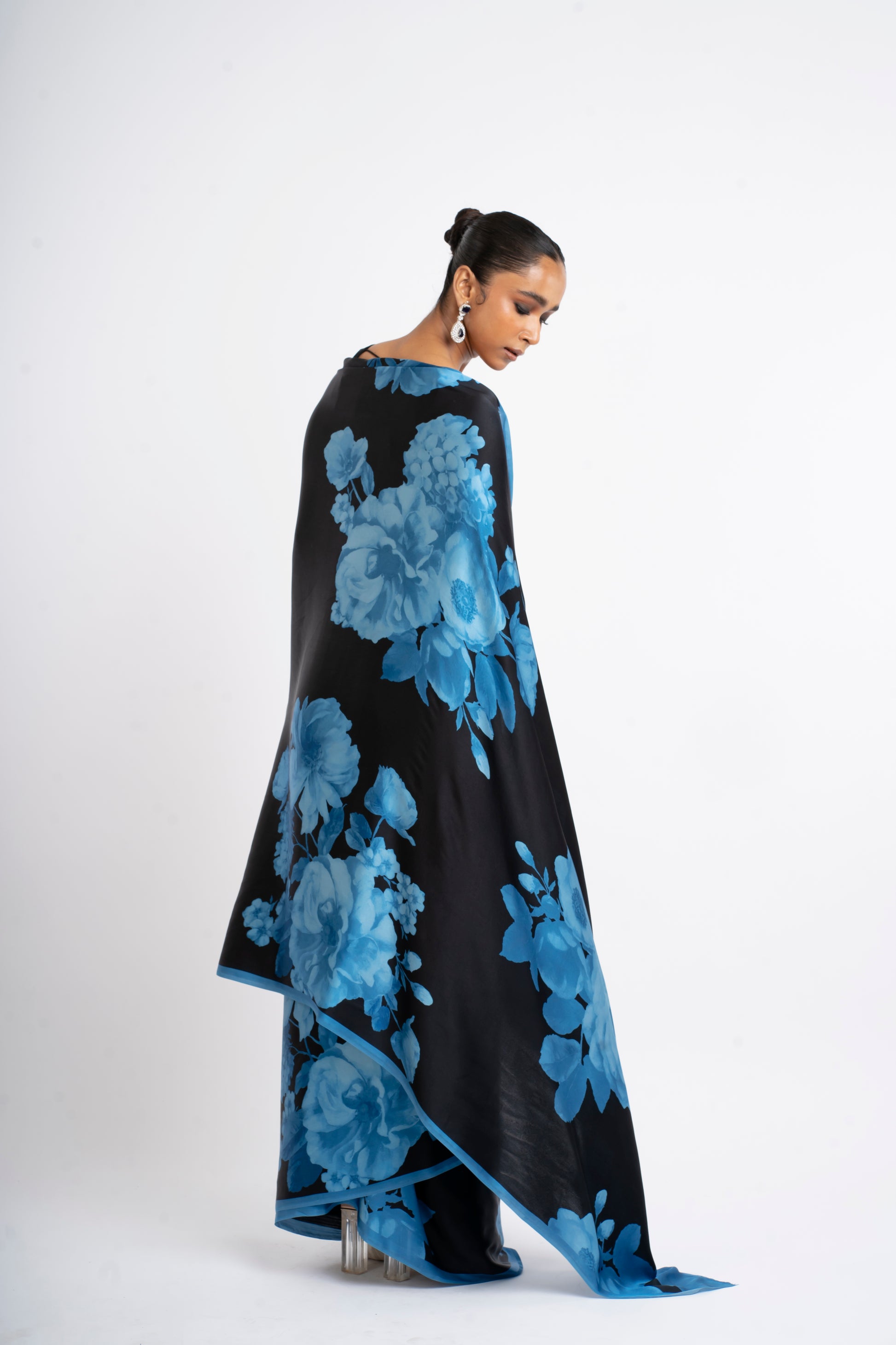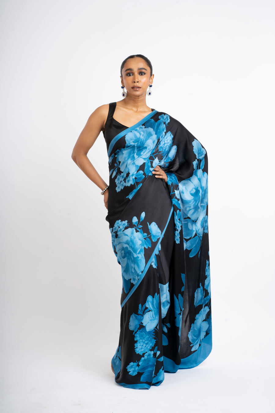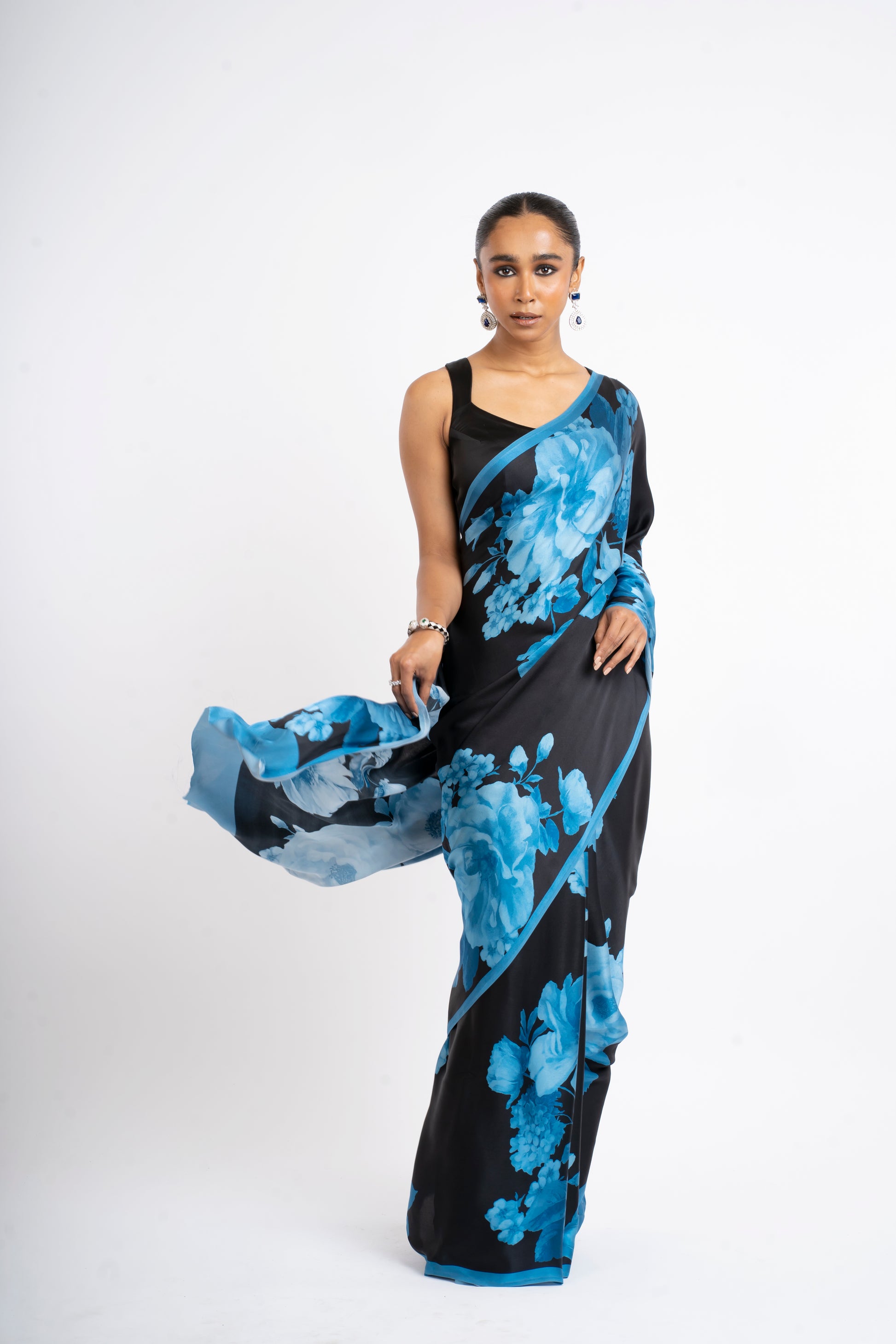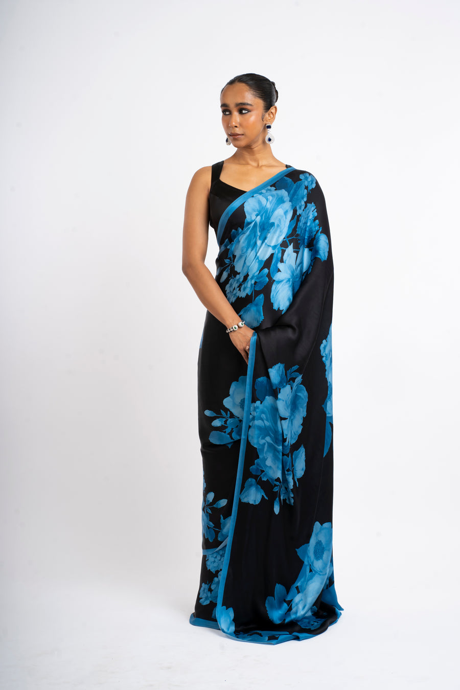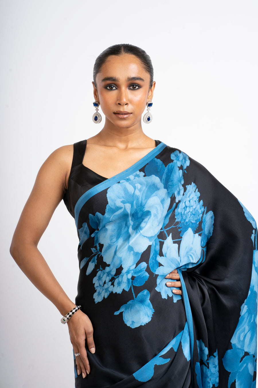 A striking black georgette saree adorned with digitally rendered abstract floral prints. The bold, vibrant colors stand out against the elegant black backdrop, making a timeless statement.