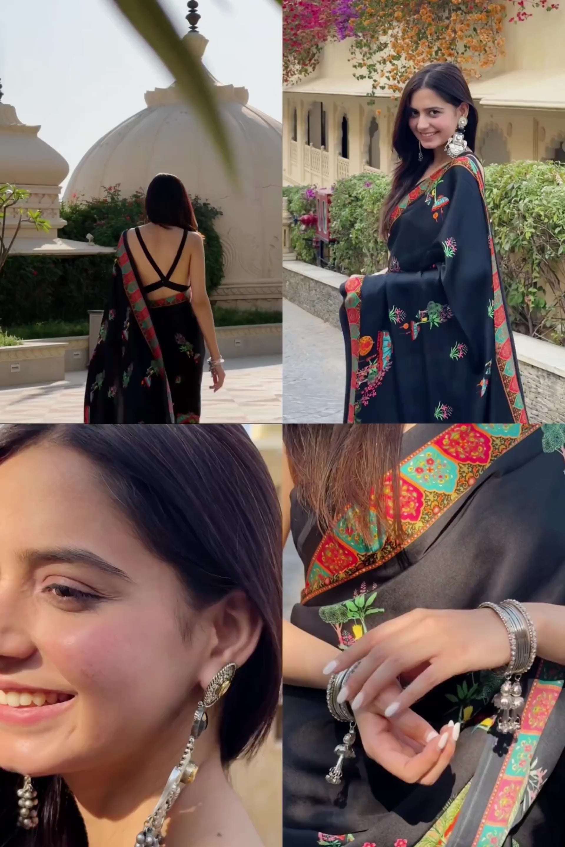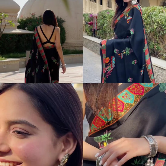 Discover the allure of Jaipur with this pure black satin silk saree in black, embellished with digitally rendered Bageecha prints. The dramatic contrast between the base and bold colors brings a touch of royal elegance to your wardrobe.