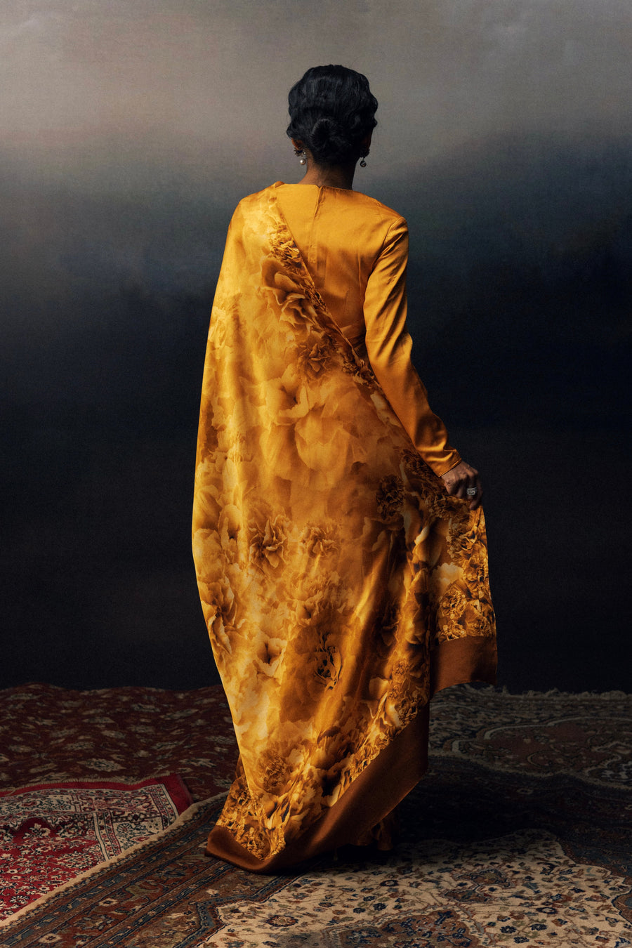 Set against a bold tangerine base, this saree showcases a captivating abstract Tak design that blends dynamic geometric shapes with artistic flair. The vibrant hue paired with the unique pattern creates a modern and sophisticated look, perfect for making a statement.