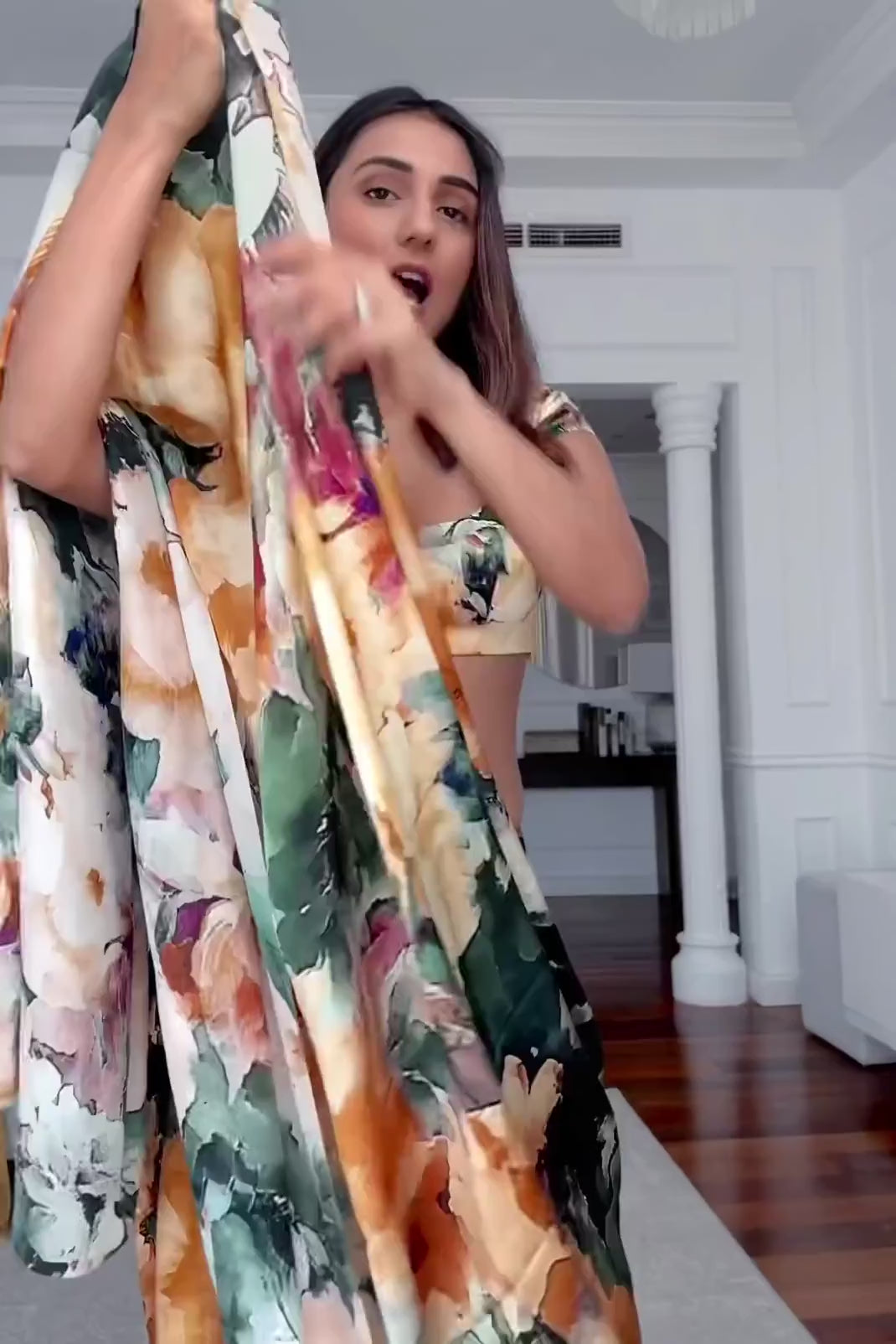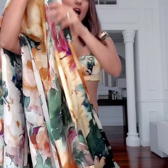 The Ruby Apricot Satin Silk Saree features an abstract print in soft apricot, offering a perfect balance of warmth and elegance. It is the perfect cocktail party saree for creating a unique look with classic charm because it is designed as a sophisticated cocktail saree.