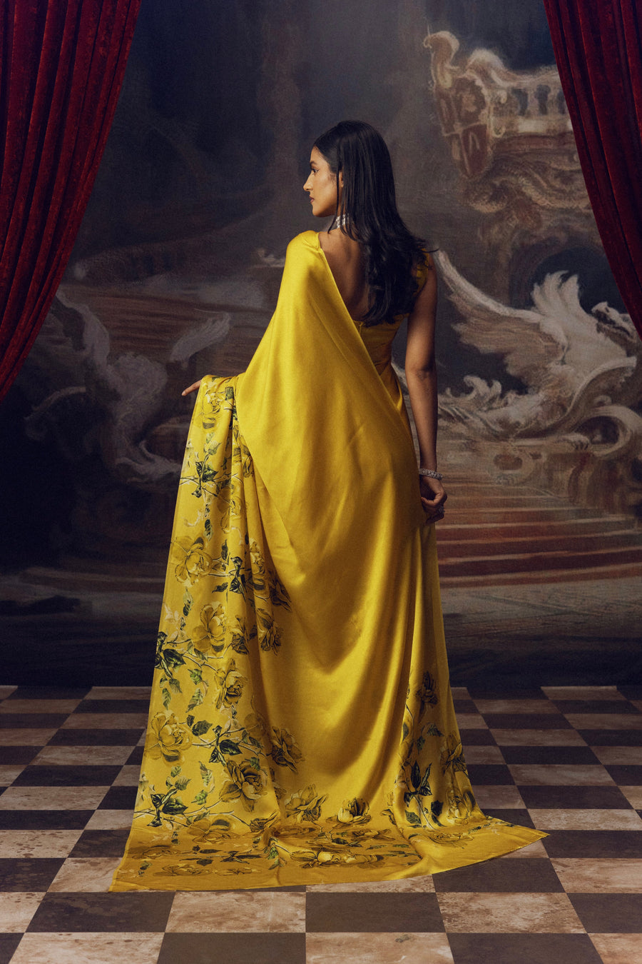 Monotone shaded flowers on the border side, set against a vibrant canary yellow backdrop, offering the sophistication of a minimal look paired with the timeless grace of florals.