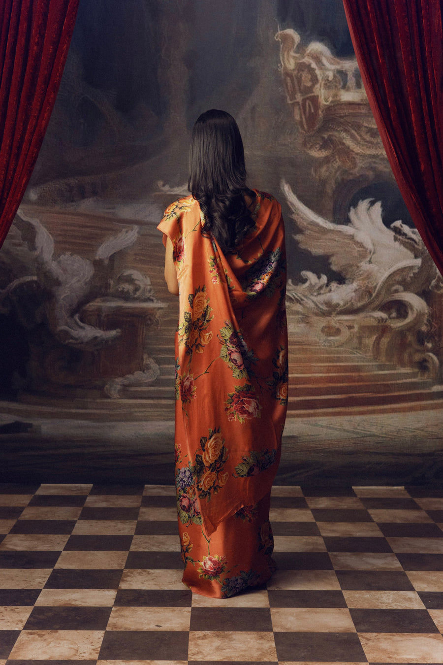 Featuring a burnt sienna base, this chiffon saree is adorned with digitally rendered CrossStitch embroidery of lively flower bunches. The gentle warmth of apricot beautifully enhances the vibrant floral details, creating a graceful yet striking color palette.