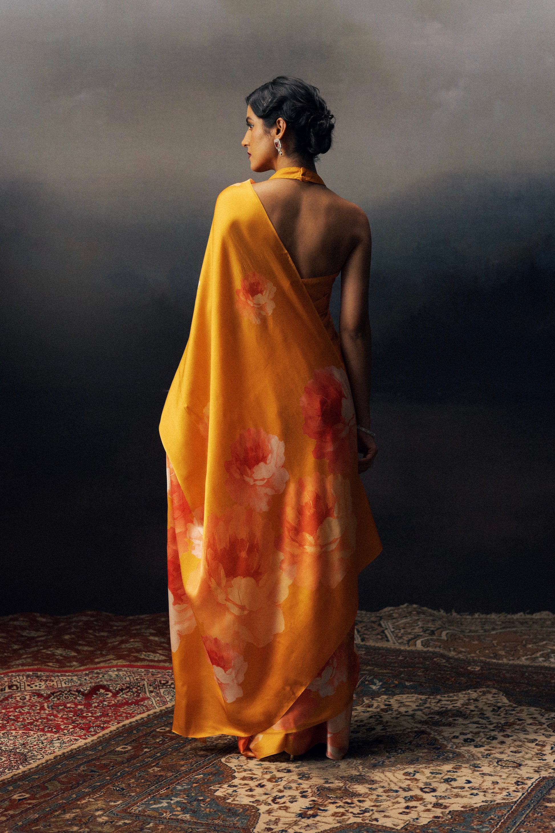 This saree features a beautiful ombré effect, starting with a radiant valencia orange base that gradually transitions into softer hues. Intricate floral patterns bloom delicately across the fabric, adding a touch of elegance and charm to the vibrant gradient. A perfect fusion of bold color and graceful florals, ideal for a standout look.