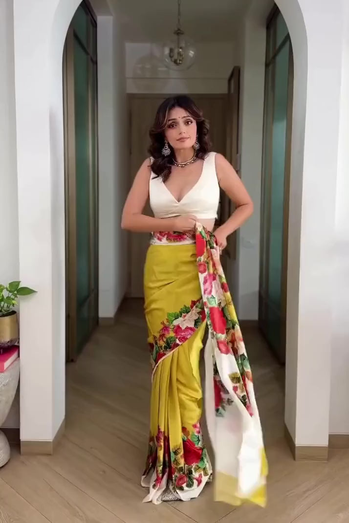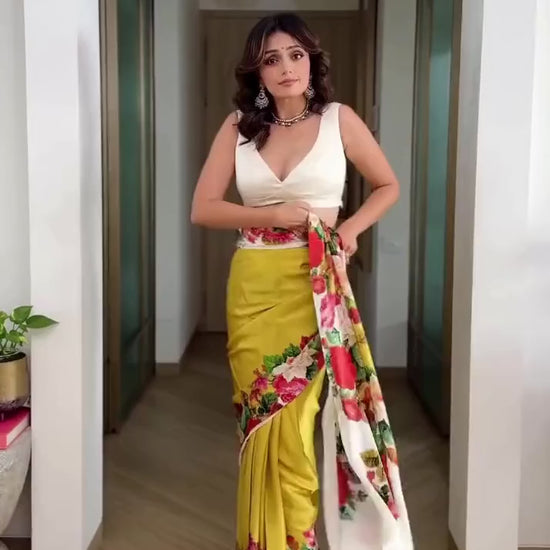 Digitally rendered to mimic cross-stitch embroidery with a pixelated, modern twist, the Urmila Canary Yellow Satin Silk Saree features a sleek white border and intricate monotone floral motifs. This satin silk saree creates graceful illusions of flowing lines, enhancing the drape for a flattering silhouette that beautifully blends tradition with contemporary sophistication.