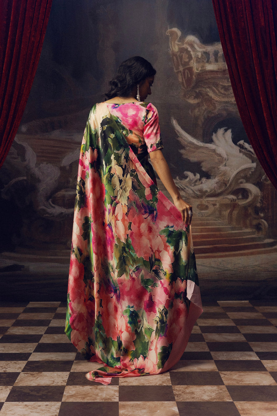 An abstract print in vibrant fuchsia, this silk saree creates the perfect blend of boldness and elegance, making it an ideal cocktail party saree for a standout look. This saree is ideal for special events and nighttime celebrations, and it guarantees that you will turn heads wherever you go.