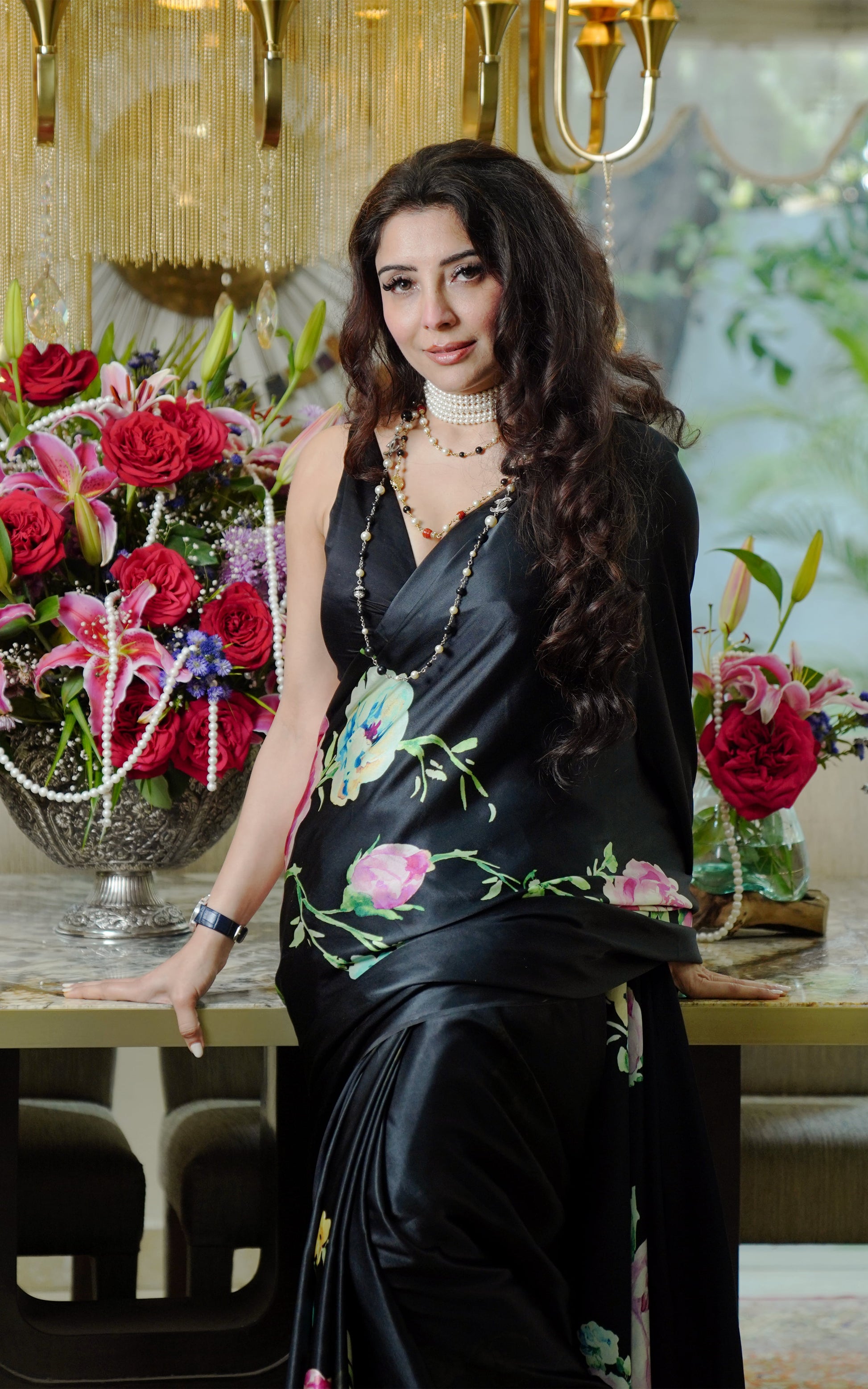 A blend of luxury and artistry, this black satin silk saree features a black base with bold, digitally rendered abstract flowers. The hand-painted details in vibrant colors create a striking contrast against the elegant background.