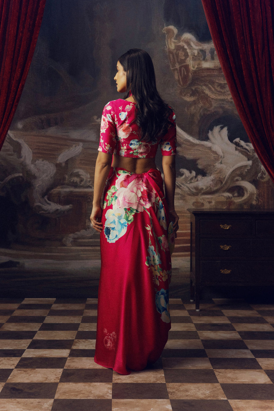 A blend of luxury and artistry, this georgette saree features a magenta pink base with bold, digitally rendered abstract flowers. The hand-painted details in vibrant hues create a striking contrast against the rich, vivid backdrop.