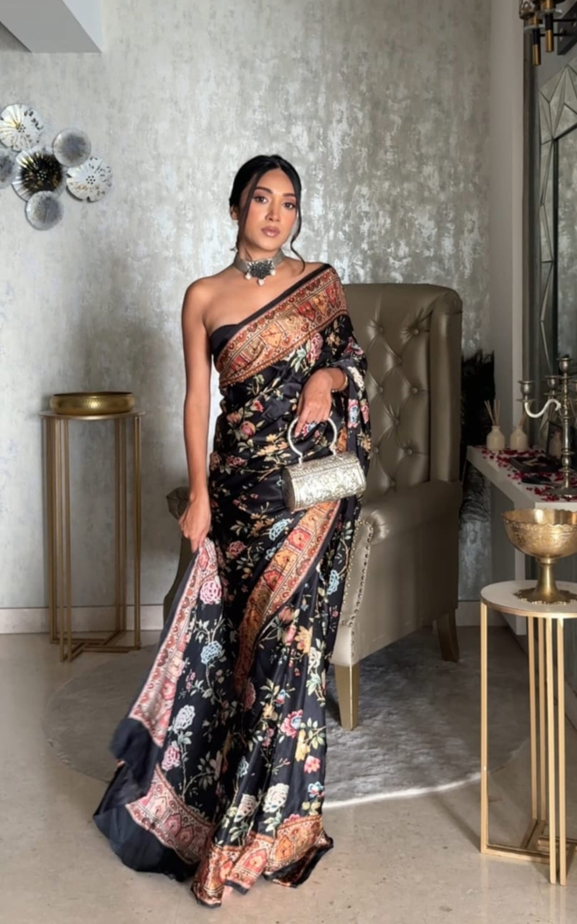 Featuring a rich black satin silk base, this saree is adorned with a digitally rendered Chintz floral design that bursts with a captivating array of colors.
